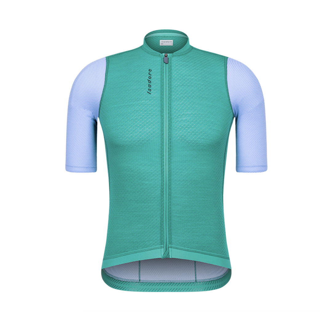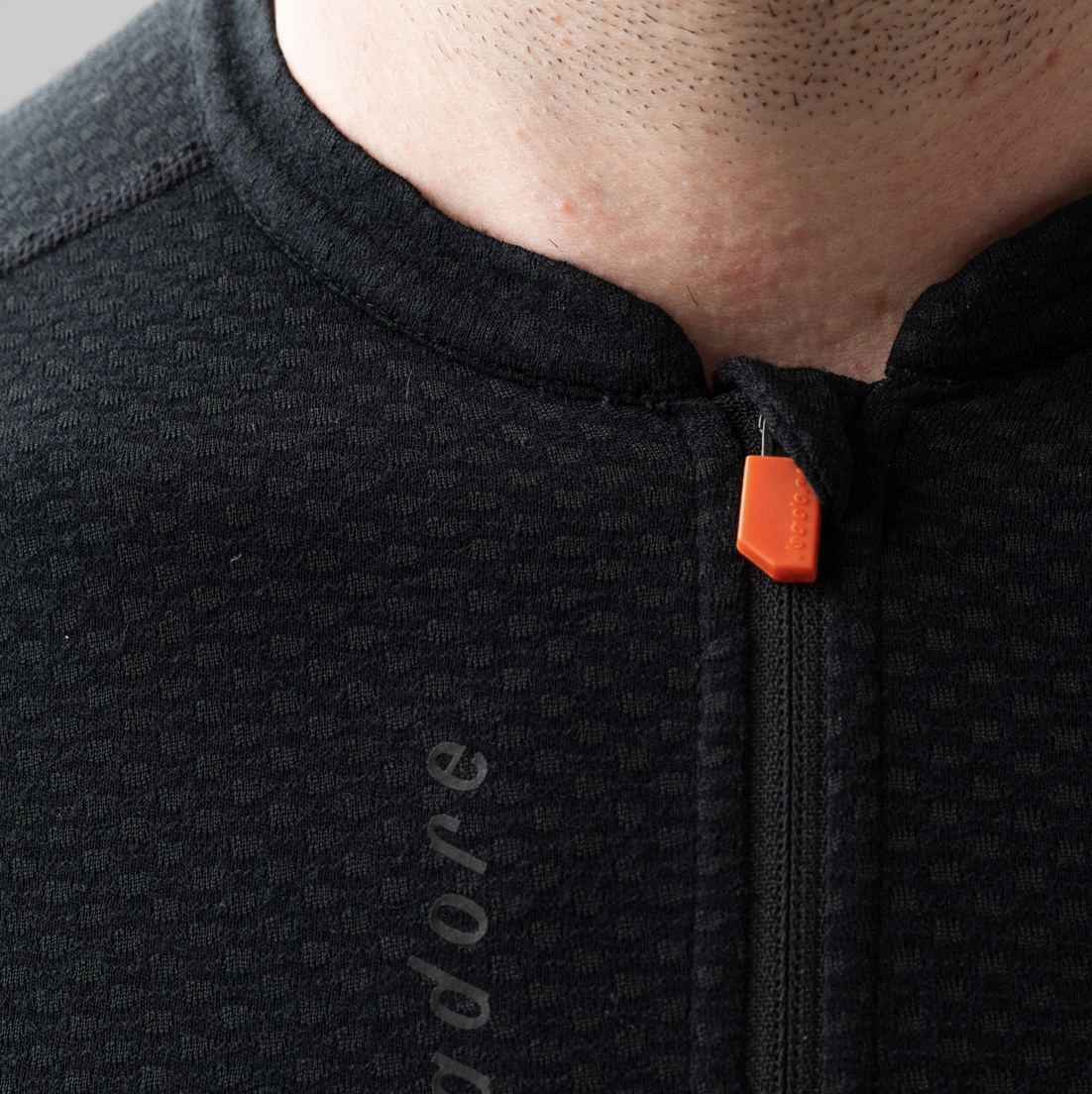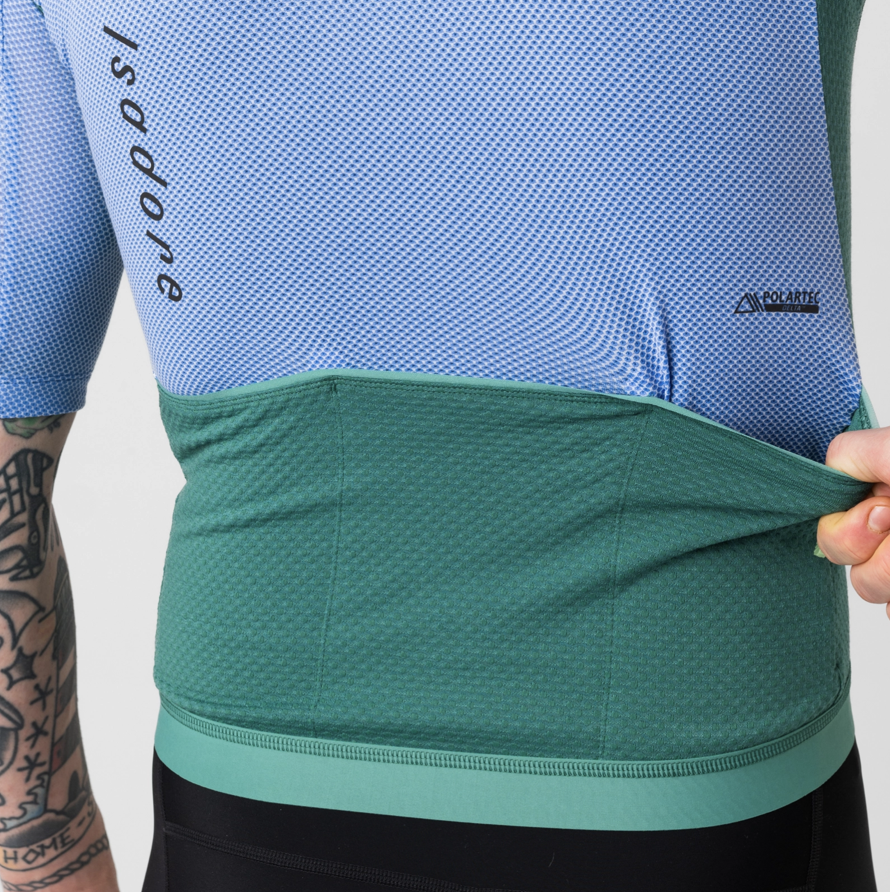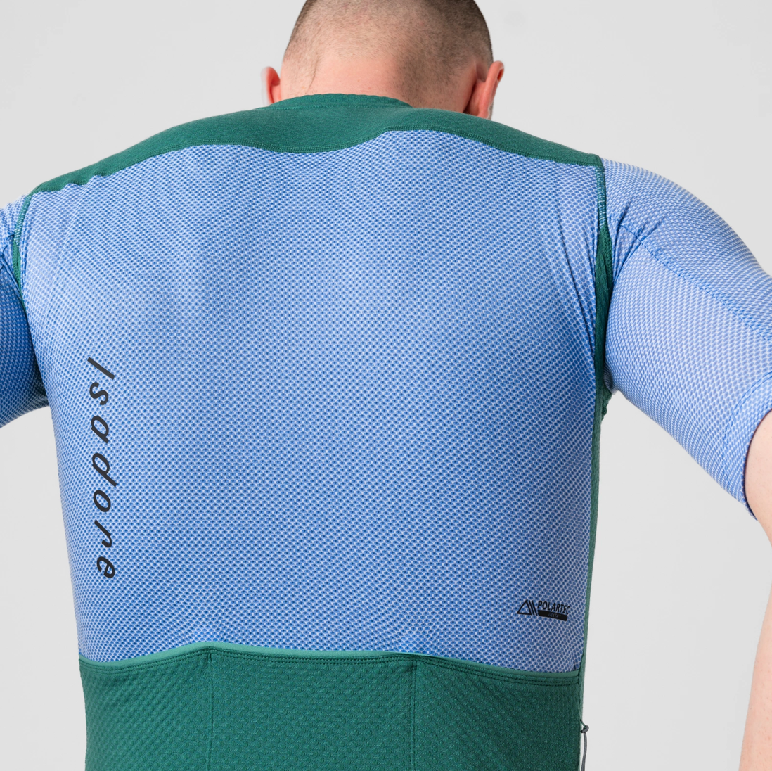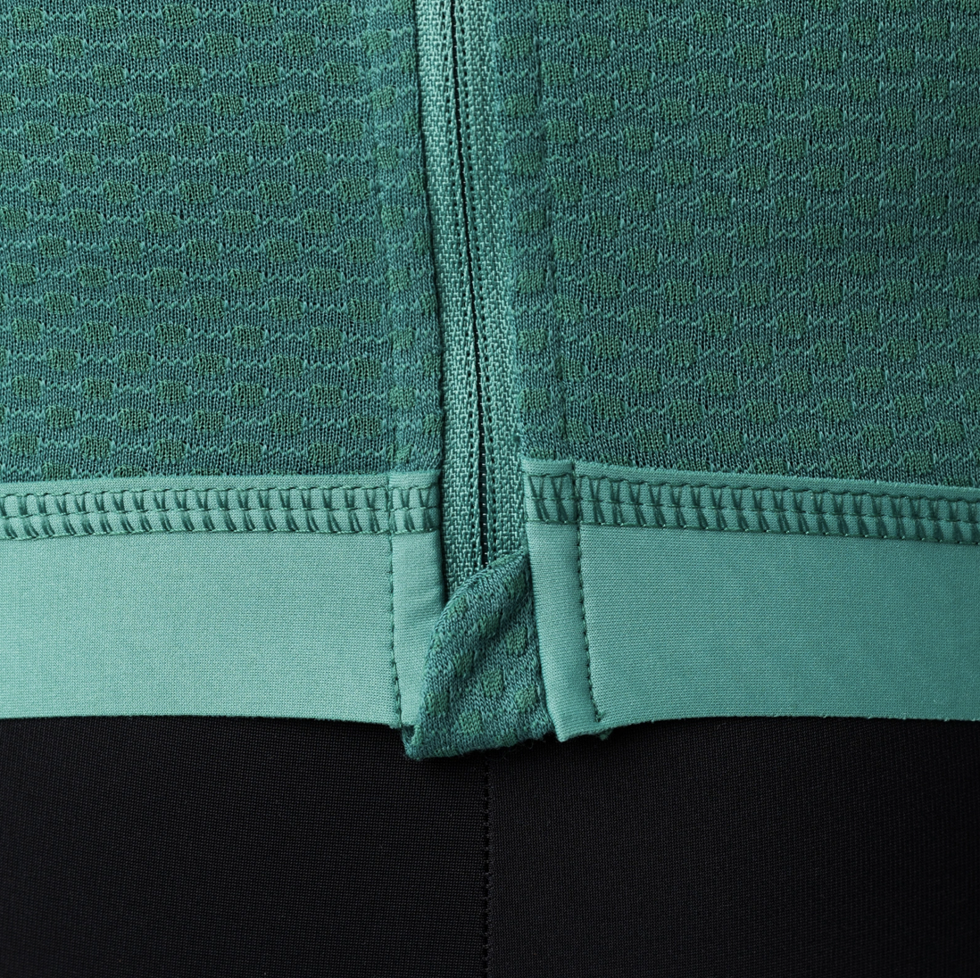 Breathable merino jersey made for intense training on really hot days for the natural feel of natural materials. The main material is a blend of synthetics and with a high merino content. It is perforated, breathable and quick-drying. The back panels, sleeves and pocket area are made of Polartec® Delta™ material with 3D structure and lyocell content. It is very light, elastic, characterized by quick-drying properties and cooling effect. Smooth feeling of natural materials in contact with the body is enhanced by the increased merino wool content, 3D fabric structure and flat seams. The jersey features 3 spacious back pockets, one zippered pocket and reflective logos on the front and back. One-way recycled zipper is covered with a flap and zipper garage that protects the bibs and leather from abrasion.