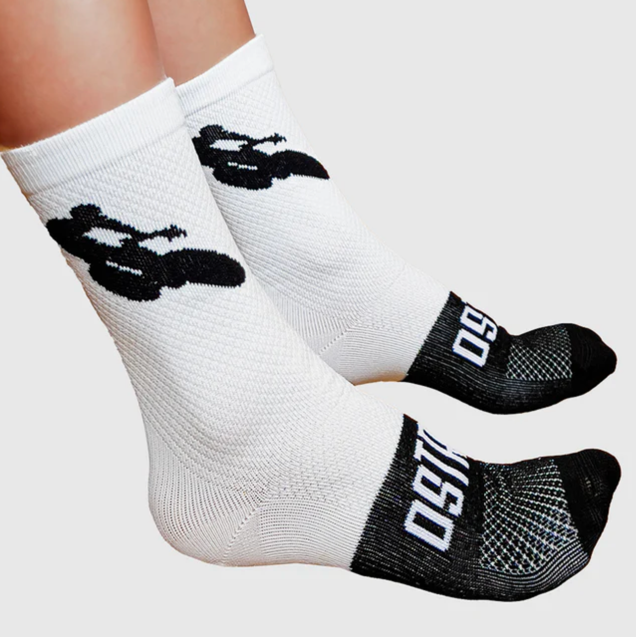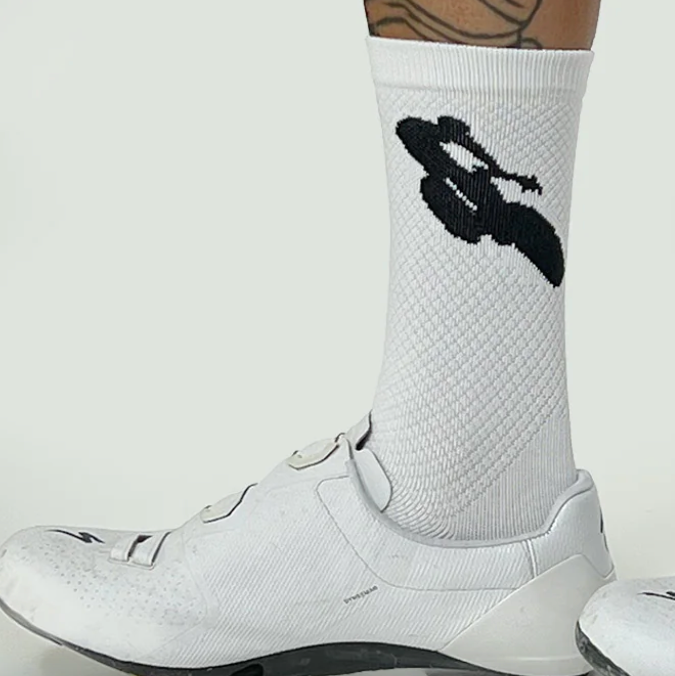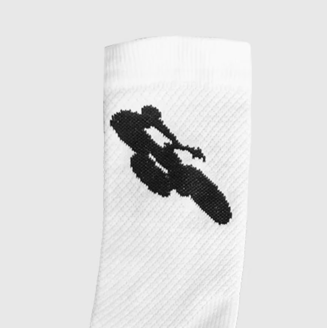 The iconic cyclist on white socks.