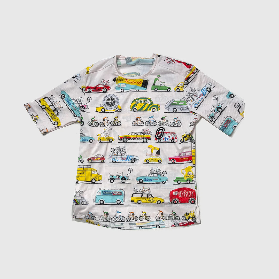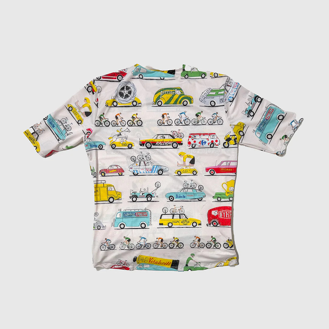 La Caravane (The Caravan) is the parade created by and for race sponsors that goes off two hours ahead of the riders in the Tour De France. It was founded in 1930, conjured up by Tour founder Henri Desgrange. Conceived originally as a way to pay for the organizer-supplied bicycles that riders had to use at the time. Behind the riders, there is a retinue of team support cars, motorcycles for spares, filming, and race officials. It's like a whole circus and major sporting event operations crew on wheels. La Caravane celebrates the spectacle of the caravan, highlighting some classic vehicles from cycling's golden age.