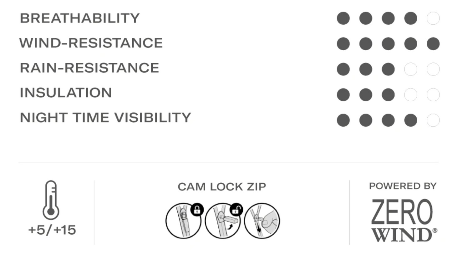 Made with the 2 layer Tovel Bio Zerowind membrane fabric. Ideal for wind and light rain protection.