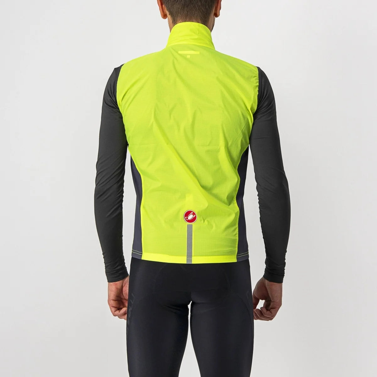 Castelli has completely re-engineered their entry-level vest. A new coated ripstop fabric keeps the wind off the front and sprays off the back, while the tightly knit side panels allow the vest to stretch to fit a wide range of shapes while keeping a close-to-body fit that eliminates fabric flapping in the wind. The collar is cut high and the back long for extra protection and the color blocking of the stretch panels and the reflective details on the chest and tail give it an elegant design touch.